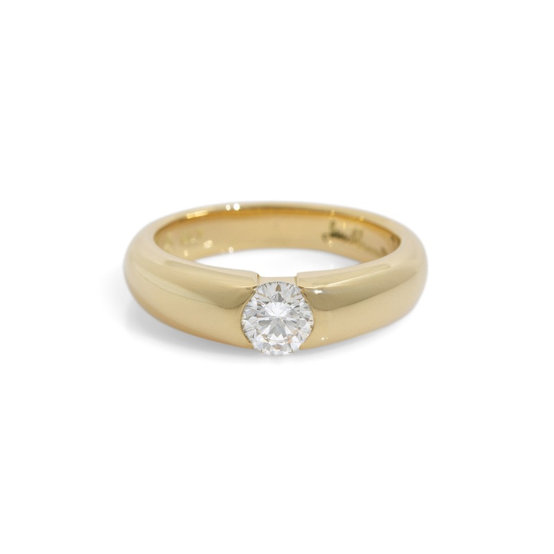 This bold and classic gold ring has been designed to embrace the diamond in a semi tension setting, making it the designs main focus. We selected this high quality half carat round brilliant cut Diamond for its radianceand striking presence.Do you desire a