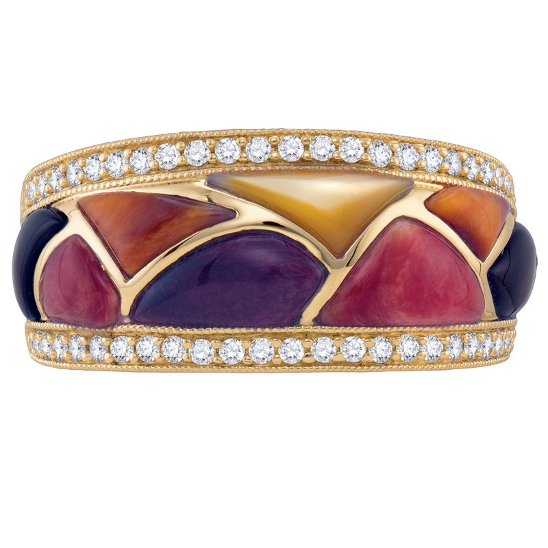 14K Yellow Gold Kabana Ring with Spiny Oyster, Mother of Pearl Inlay and 0.25 Carats (total weight) of Diamonds. Please indicate the ring size desired in the Customer comment field at checkout. Some sizes may require additional delivery time and may result