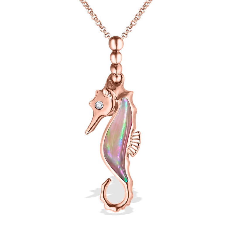 14K Rose Gold Kabana Seahorse Pendant with Pink Mother of Pearl Inlay and a 0.01 Carat Diamond. 18" 14K Rose Gold chain included. The pendant measures approximately 1 1/8" in total length including the bail, and 7/8" excluding the bail.