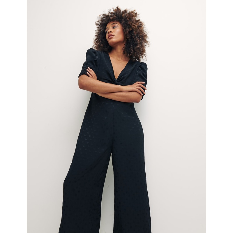 If you’re a fan of the Katty dress, you’re in for a treat. The Katty jumpsuit plays host to features you already have a soft spot for, like the twist front detail on the bust, the V-neckline and short sleeves. Decorated by a classic spot print and falling to a wide-leg fit, the black Katty is best paired with heels.