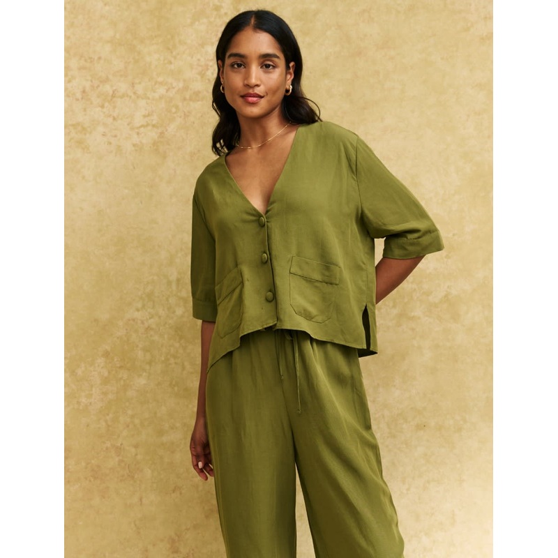 A boxy shirt is so easy to wear. Style yours with high waisted denim. Buttons Boxy fit