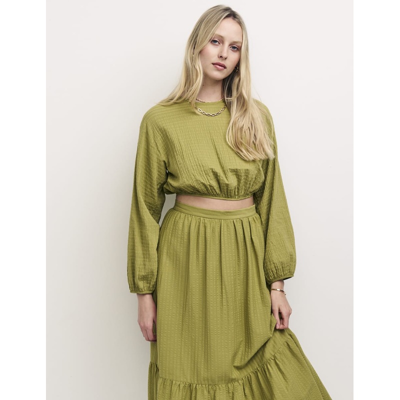 Beautiful with just the right amount of billow, our Bonnie olive green crop top was made with sunshine in mind. Cut with a touch of stretch at the bottom hem, she pulls you in at just the right spot. Complete the set with the matching Bianca skirt.