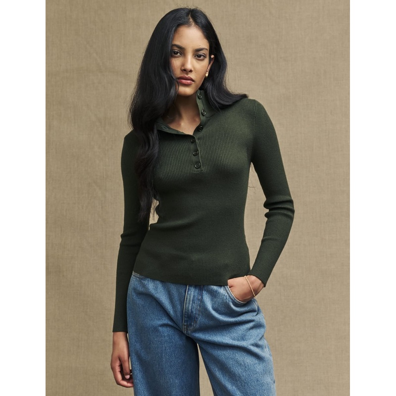 Is it the weekend yet? This green button-front knit is just what you need for casual Saturday afternoons. A high collar adds to the cosiness. Style yours with wide leg jeans.