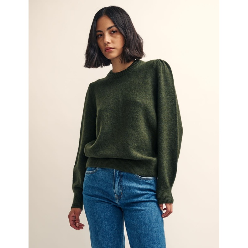 This forest green-coloured jumper is a classic. Style yours with cargo trousers or half-tucked into jeans. Crew neck Long balloon sleeves Ribbed trims
