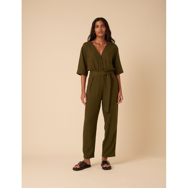 Khaki Green Linen-blend Tie Waist Jumpsuit