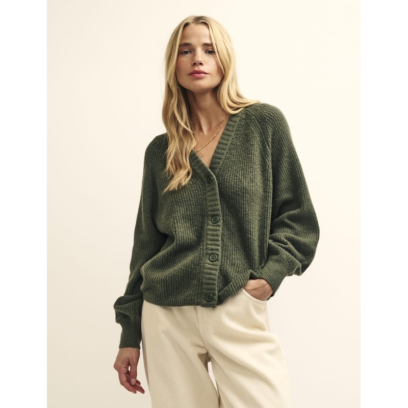 Weve got a soft spot for this cardigan. Made from fluffy khaki fabric, it features a button-through front, ribbed detailing and a deep v-neckline thats perfect for layering or styling solo. Team yours with cream denim.