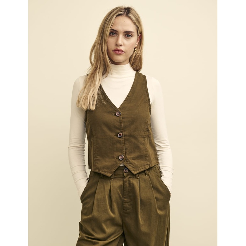 Introducing our Camden waistcoat. This olive green layering piece can be worn a number of ways. Tailored details include welt pockets and an adjustable strap at the back. Wear yours with everything from jeans to silky midi skirts.