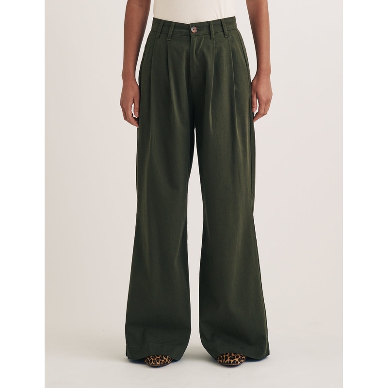 A new take on tailoring. Designed to flatter, this style nips into a pleated waist and falls effortlessly to the floor with a relaxed wide leg. We love the khaki green. Wear yours with absolutely everything.