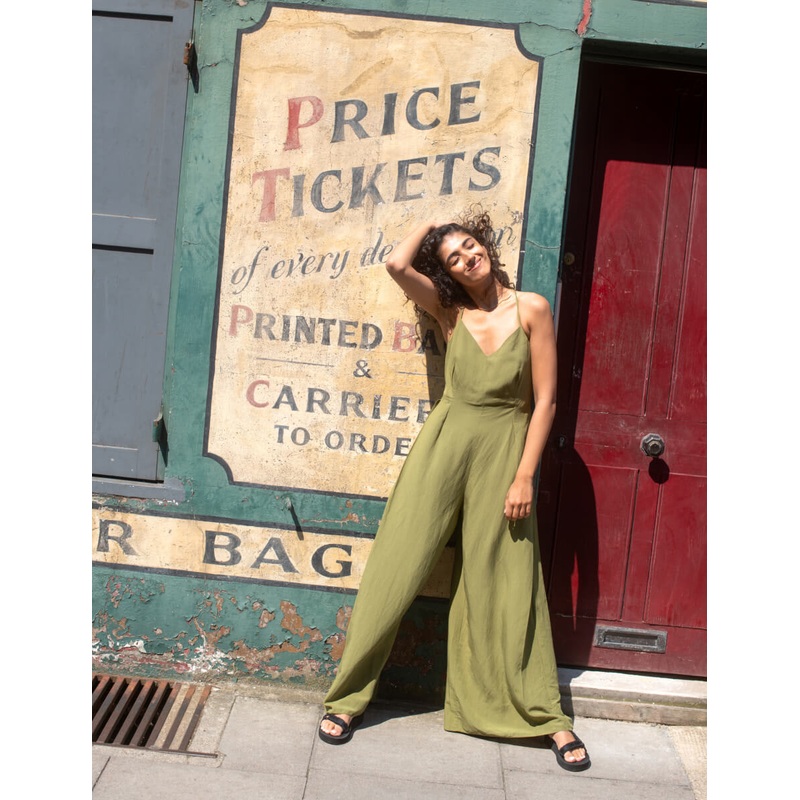 The one. Destined to be a future favourite, this olive green jumpsuit features straps before falling to wide legs. Turn around to reveal a string tie back that loops together racer style. Style yours with stompy espadrilles. Youll wear it all summer.