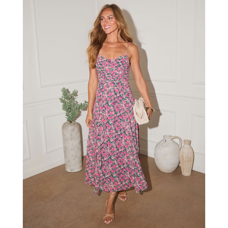 Float into the perfect summer moment with the Kienna Floral Ruffle Chiffon Maxi Dress. Designed in lightweight crepe with a soft floral print, its made for twirling through garden parties, golden hour dinners, and everything in between. The pleated bodice adds delicate structure, while adjustable shoulder straps let you find your perfect fit. Finished with cascading ruffle details at the skirt, Kienna moves with grace and ease, just like you.