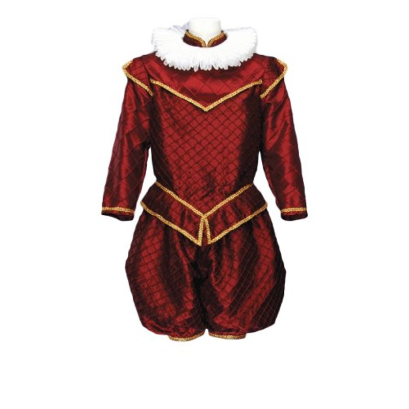 Includes: Majestic 16th Century doublet of diamond pin-tuck taffeta pattern, tunic, pumpkin pants/breeches and cape with velvet top layer all accented with gold metallic trim.Color: BurgundySizes: M (40), L (42-44), XL (46-48), 2XL (50-52)Made in USA / Sup