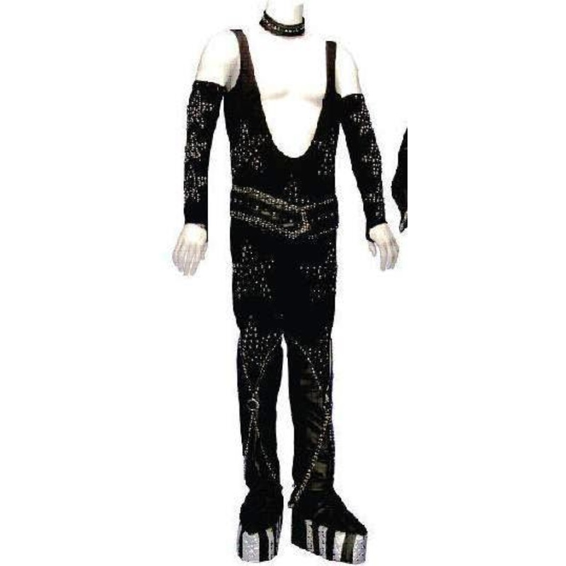 Includes: Black Stretch jumpsuit/leotard with silver star-patterned studs, silver studded choker collar with back velcro closure, matching silver stud star pattern glovelets, faux leather belt accented with silver studs, black poly-foam padded vinyl boot covers with silver stud and chain accents designed to look like platform boots.