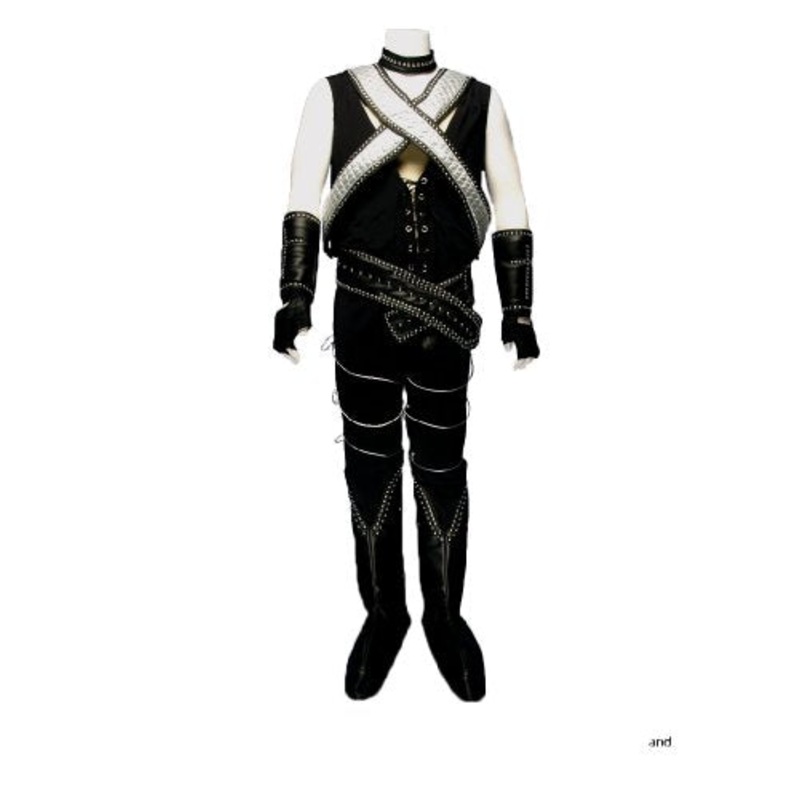 Includes: Black stretch jumpsuit with eyelet lace up front and silver cord accents on legs, black leatherette choker collar with silver stud accents, black faux leather chest piece accented with quilted silver and silver studs, faux leather wrist cuffs accented with silver studs, faux leather belt with silver star stud accents, black poly-foam padded leatherette boot covers with silver stud accents designed to looklike platform boots.