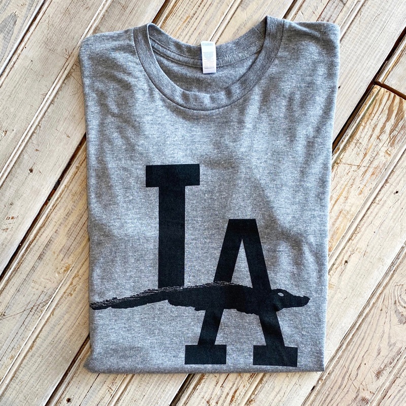LA Gator Tee in Heather Grey with Black Graphic.Unisex Fit.50% Poly,25% Cotton,25% Rayon