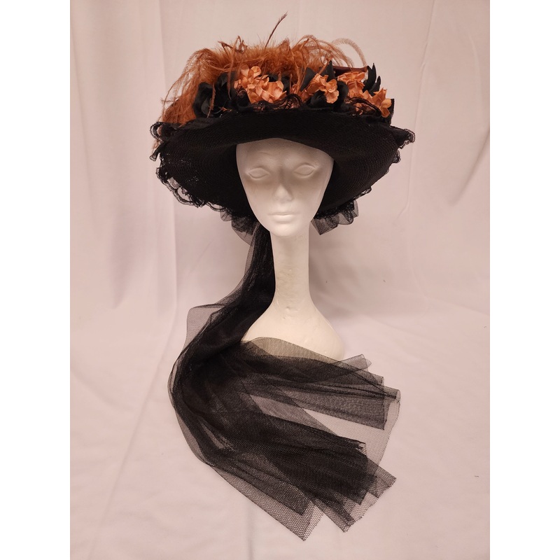 Soft elegant Black lace pleated crown with antique brown under the lace, Black ruffled lace around the brim, wide grosgrain ribbon bow, Black & Antique brown flowers, Black & antique brown ostrich plumes & a black English netting bow on the back.