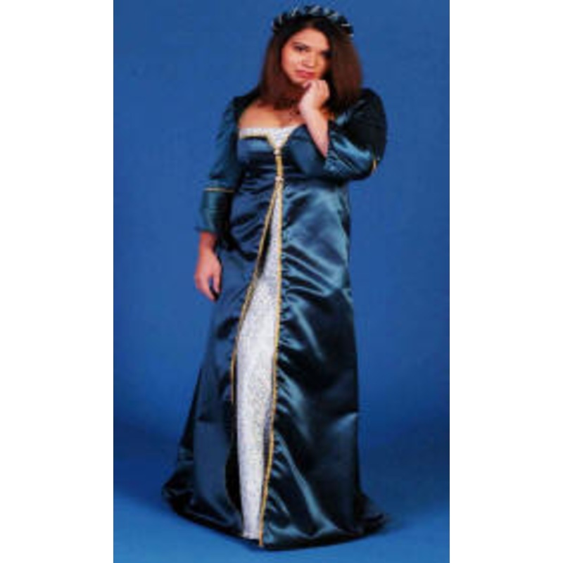 Excellent QualityBlue Satin empire waist gown with accented with brocade inset, gold metallic trim & matching renaissance headpiece.Size: XS (2-4), S (6-8)