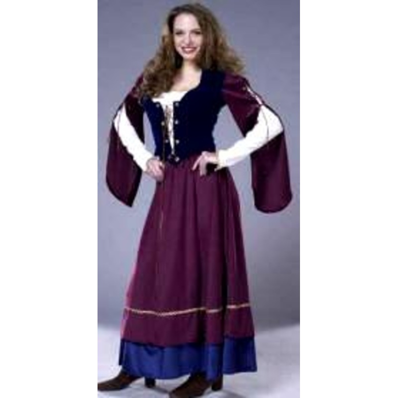 Includes: Dark Blue faux suede corseted top with faux leather lacing, attached long sleeve mock blouse, laced draped burgundy sleeves w/fitted gauze undersleeve, full-length burgundy velour skirt with layered hemline, blue & gold accents &elastic fit waistband.