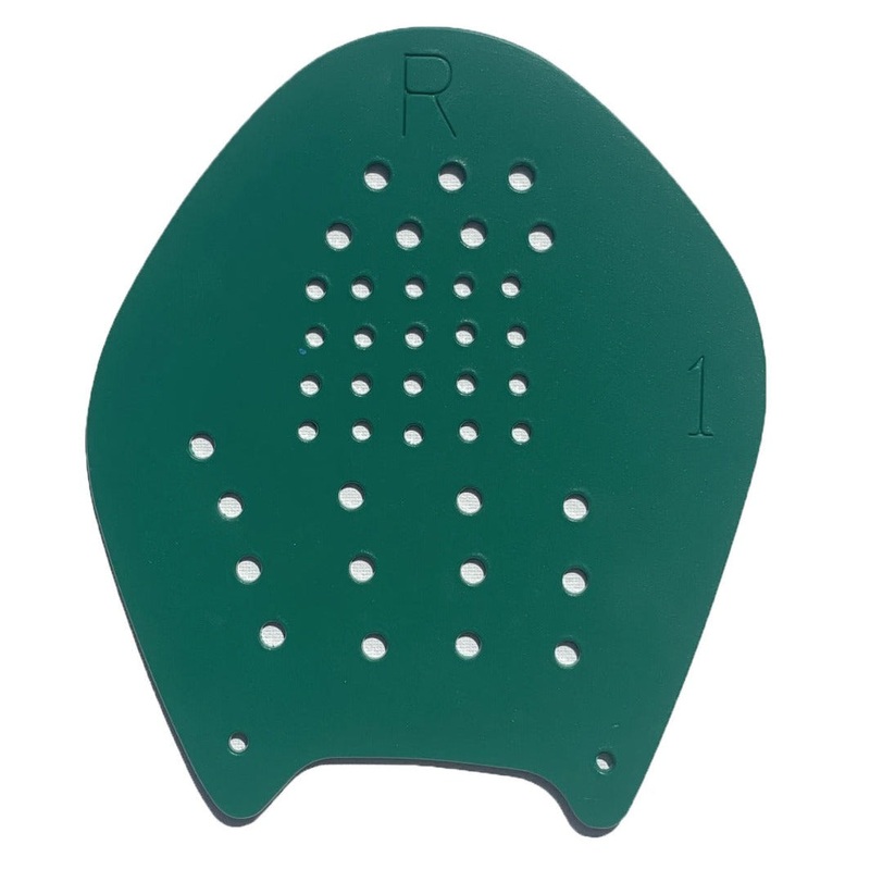 Strokemakers were designed to build strength and provide stroke correction. The hand should fit completely on the paddle with the thumb and first finger near the edge allowing the pinky to have some space on the outside edge. Hand size in relation to the paddle is the primary way to determine correct sizing. The hand being slightly offset allows for fully finishing the stroke and the outer edge water foil builds strength without putting pressure on the joints.