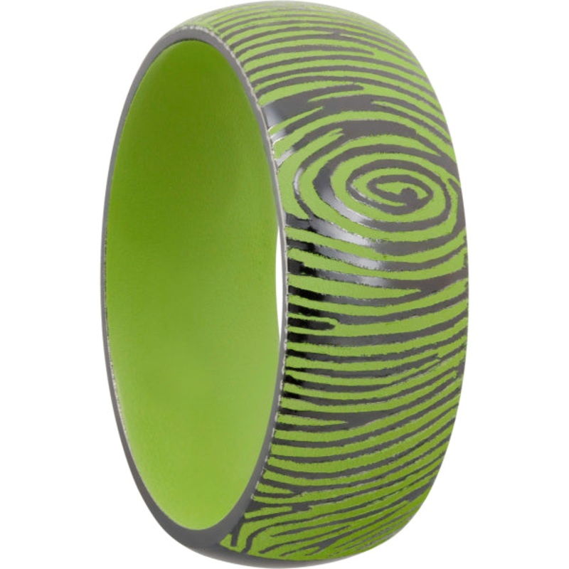Zirconium 8mm domed band with a laser-carved fingerprint featuring Zombie Green Cerakote in the recessed pattern and on the sleeve. This beautiful product isn't always in stock. Our online inventory shows everything that we produce and some products need t