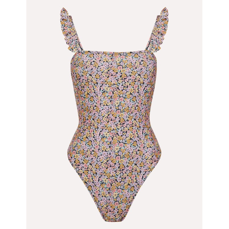 Cut to a modest silhouette, our Laura swimsuit is fit with a square neckline, frilly straps and decorated in a sweet floral print all over. Now, to book your holiday.