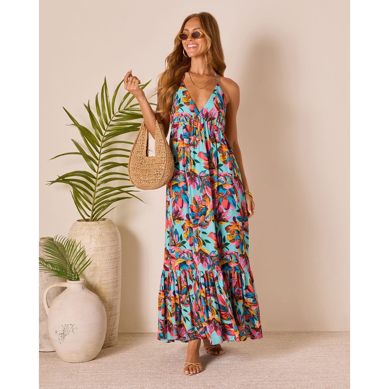 Step into instant vacation mode, even if youre just heading to brunch in the Leniah Tropical Floral Maxi Dress. This stunner shows up in a soft textured knit jersey with an open back and halter tie neckline that says sun-chaser with style. The tropical floral print brings all the dreamy, getaway feels, while the tiered pleated hem floats with every step for that effortless, caught-the-breeze moment.