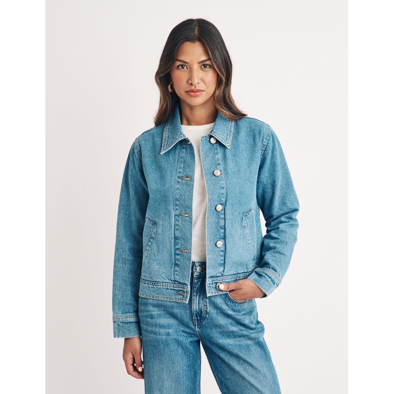 Meet our Frankie jacket. This preppy mid wash denim number is cut for a relaxed fit, and her cute collar, front pockets and buttoned front make her the ultimate day-to-day companion. Style yours with a while top, denim and boots. Collar Long sleeves Button
