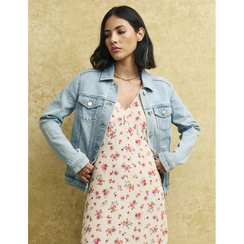 Just throw on and go. This light-wash denim jacket has all the classic details including authentic tobacco top stitching. Designed for a slim fit, with patch pockets and silver-tone buttons. Style yours with a floaty dress or jumpsuit.