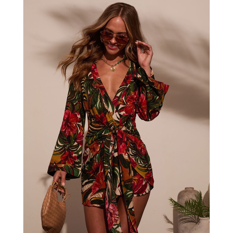 The Lost In The Tropics Wrap Mini Dress is the epitome of sun-soaked elegance with a playful twist. Crafted from lightweight jersey fabric, this dress drapes effortlessly, keeping you cool and stylish all day long. The surplice front with a mini hook-and-e