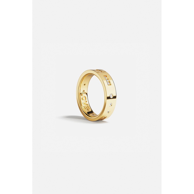 This collection is using Morse code as a secret Love language.This ring is embellished with the code LOVE on it, and the word LOVE is also engraved inside.This ring is made with APM Yellow Alloy and 18k gold plated layer of 3 microns. It ismicroset with wh
