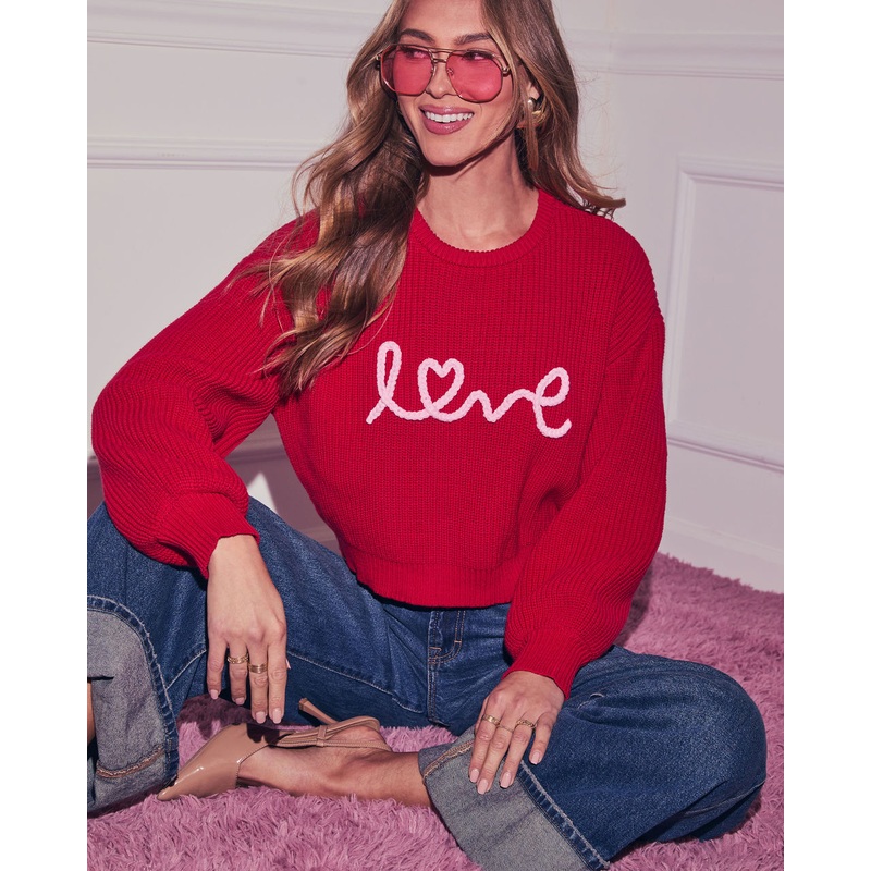 Celebrate your heartfelt moments in the Love Script Graphic Sweater, thats as stylish and dreamy as your love story. Made from cozy midweight ribbed knit fabric, this dreamy sweater wraps you in warmth while featuring a charming raised script design that w