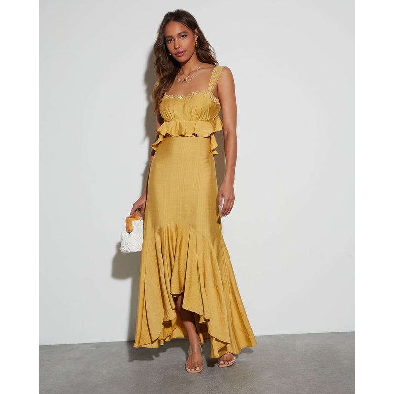 Lace strapsRuffle waist detailTie back closureHigh low hemMaxi lengthSelf: 80% Rayon 20% Polyester, Lining: 100% PolyesterRuns Small