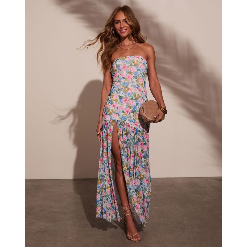 Perfect for weddings, rooftop soires, or romantic date nights, the Luxe Aura Strapless Floral Maxi Dress strikes the perfect balance between feminine and bold. With its dreamy mesh fabric overlay and vibrant floral design, this dress is pure elegance with