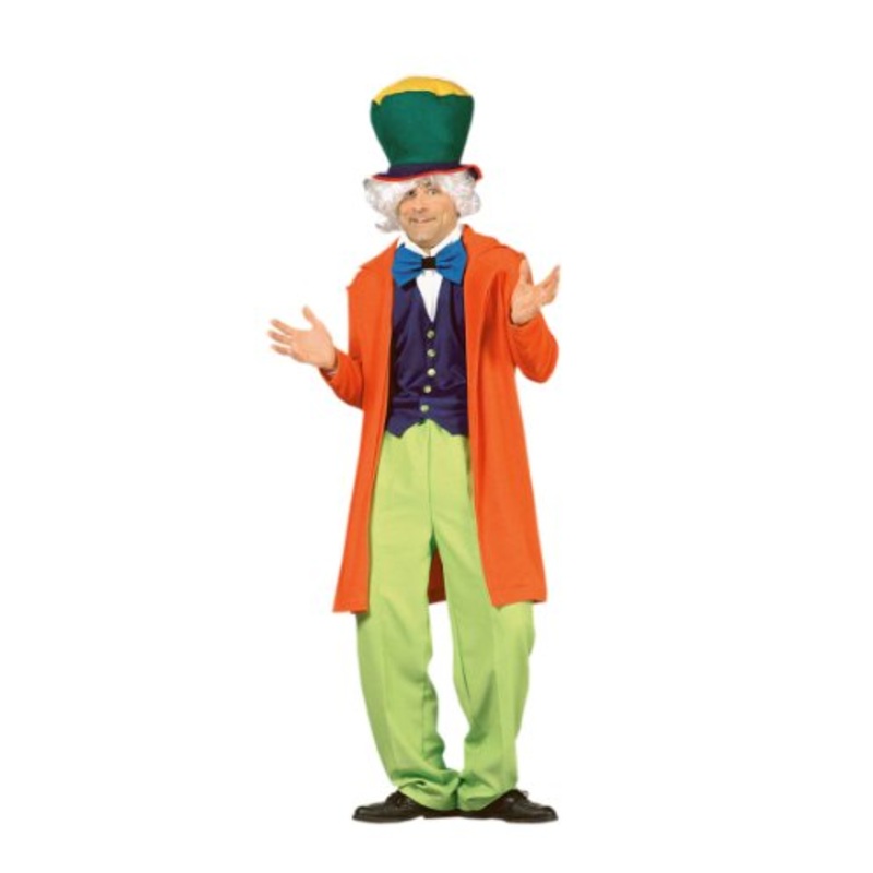 Who is the crazy character Alice runs into while she is in the Wonderland who always wants tea? Why its the Mad Hatter of course!Includes: Orange 3/4 length Jacket, Lime Green Baggy Pants, Purple Vest, Multicolor Top Hat & Oversized Blue Bow tie.Color: Ora