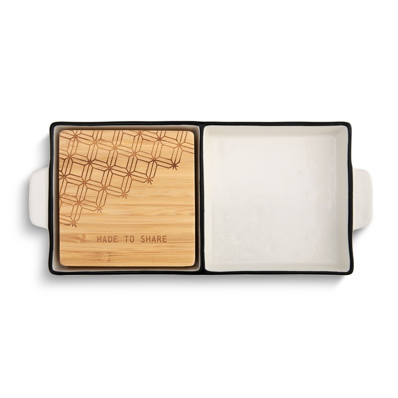 Everyone has a serving platter at home, but the Made to Share, 2 in 1 Serving Dish from the ByDesign Serving Collection is something special, indeed. It is divided into two sections for serving separate items such as chips and dip, olives and cheese bites or two different sauces. As a special surprise, there is a bamboo cutting board that is stored under one side of the platter that can be removed to cut cheese bits or serve more appetizers on. It’s a dynamic, useful and stylish design, all in one. Platter is made of stoneware with white glaze and bears the sentiment “Made to Share.” Kitchen essentials make great gifts for friends and family that will use them often and be reminded of you every time they do. Gift this useful dish for wedding gifts, birthdays, the holidays, housewarming gifts or as a special surprise when they’re not expecting it.