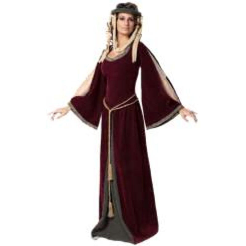 Includes: Full length burgundy stretch suede dress with contrasting olive green suede cloth inset, gold jacquard accent edging on collar & sleeves, open bell sleeves w/gold accent undersleeve, gold tasseled waist rope belt & olive green medieval headpiece with gold streamers.