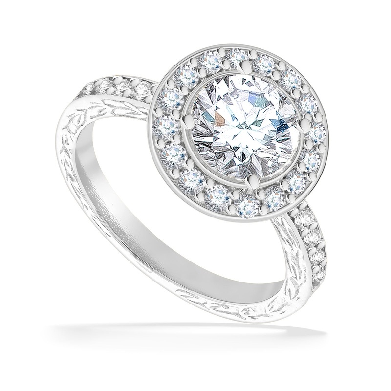 14K White Gold Maile Scroll Solitaire Halo Ring with a Round 1.50 Carat I SI2 Center Diamond and 0.47 Carats (total weight) of GH SI Halo and Side Diamonds.