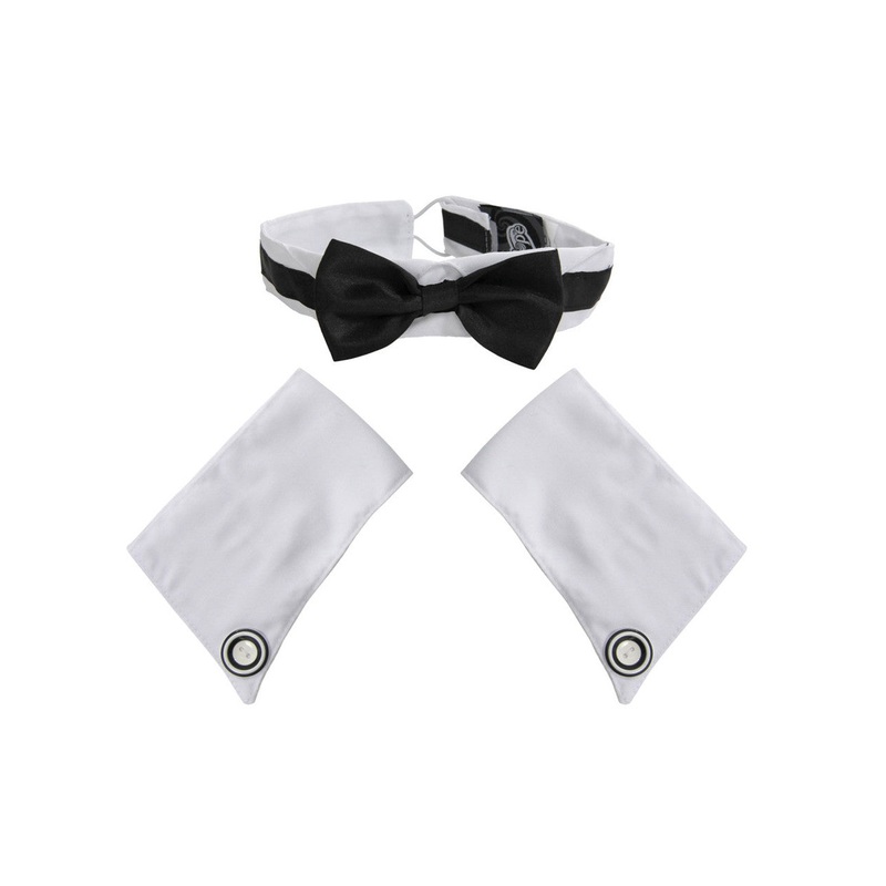 Elope Male Dancer KitDance the night away with this Male Dancer Kit. The accessories are 100 percent polyester and include a white collar with an attached black bow tie along with white sleeve cuffs with decorative buttons on the side. The cuffs have hook-