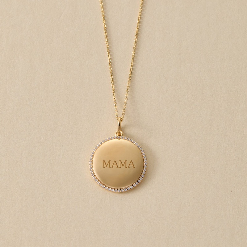 The name that says it all. This Mama Pav Pendant is surrounded by 1mm gemstones around the outer edge. In stock and ready to ship.available in sterling silver and gold vermeil (sterling silver base with 100+ mls of 24k gold )stones are CZs and 1mm eachpend