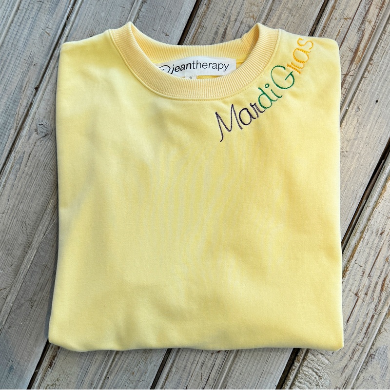 Mardi Gras Embroidered Sweatshirt in Yellow.Relaxed fit.