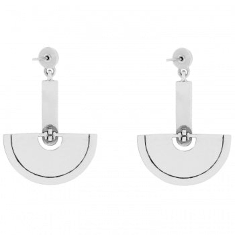 Texture and etched metal combine with strong geometric shapes for earrings that are both boho and eclectic. Finished with cabochons of blue sodalite.Width: 1 1/8"Type: Post with flat disc backDrop: 2 1/2"Finish: Silver platedStones: Blue Sodalite