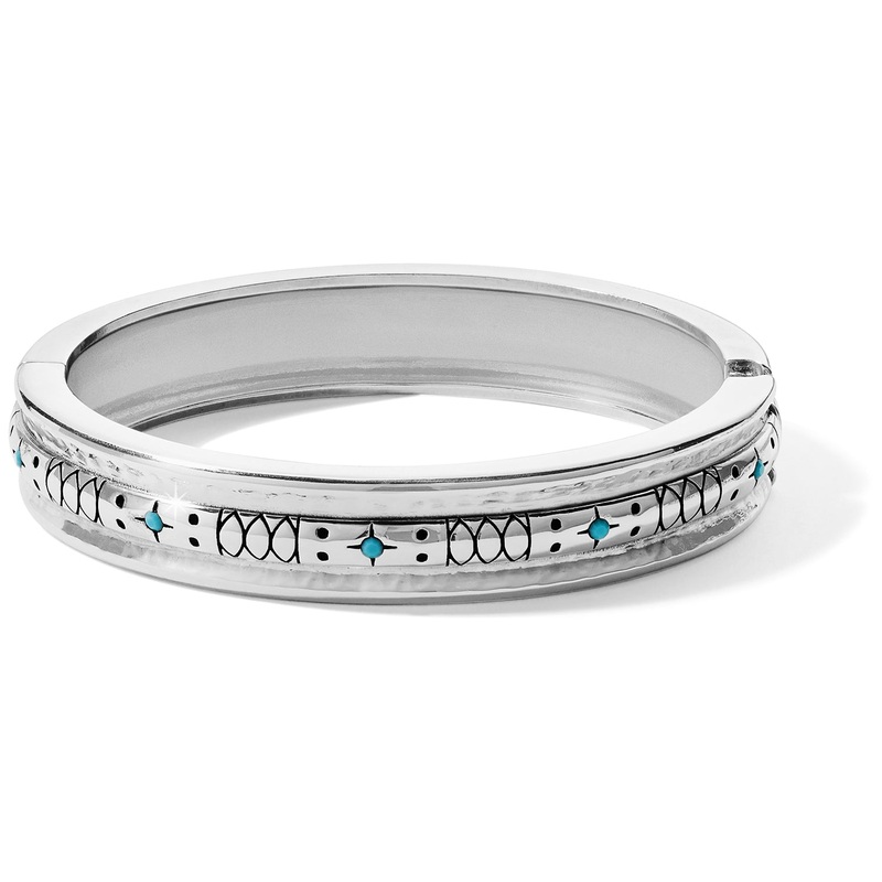 A silver etched hinged bangle accented with turquoise colored stones is perfect to wear alone or stack with other textured bangles.