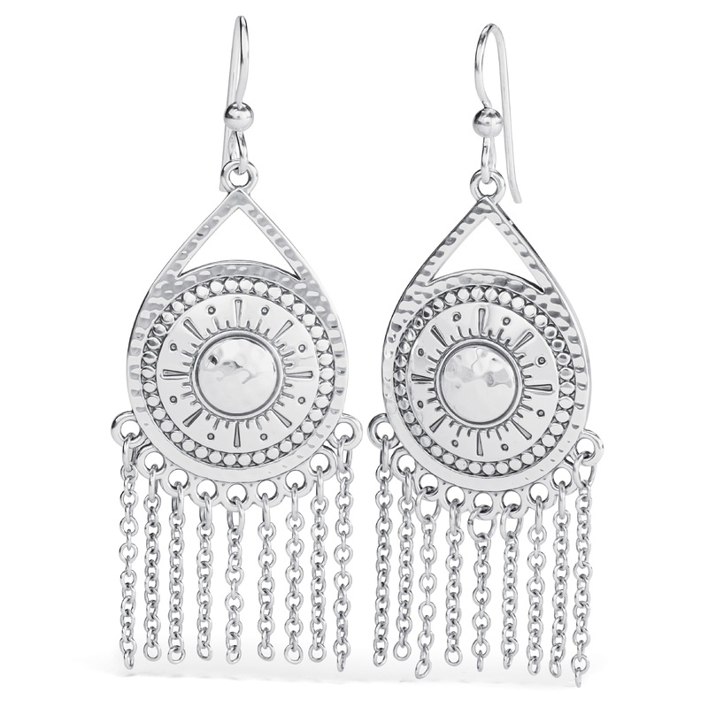 Beautiful etched silver-plated medallions and beaded fringe make these exotic swingy earrings the perfect accent to turn your neutral outfit into a chic statement-maker.