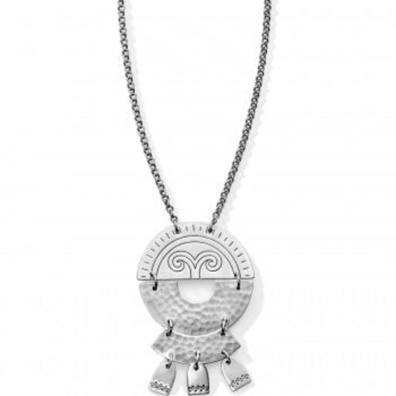 With a fresh twist on geometric motifs, this exotic collection includes sun-inspired shapes representing the setting sun of Morocco. This tiered necklace is an eclectic mix of polished, etched and hammered finishes.
