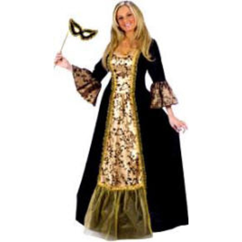 Includes: Crushed black velvet hoop gown accented with gold floral print shimmering brocade inset, ruffle sleeves & handheld eye mask.Color: Black/Gold (shown)Size:Plus (16W-22W) , Waist (32''-42'') Bust: (39''-48'')5'5'' to 5'11''Hand wash separately in c