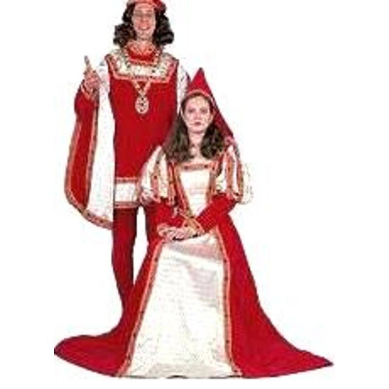Includes: Velvet and brocade dress with train, puff sleeves, and matching conical hat, all with gold metallic braided jeweled trim.