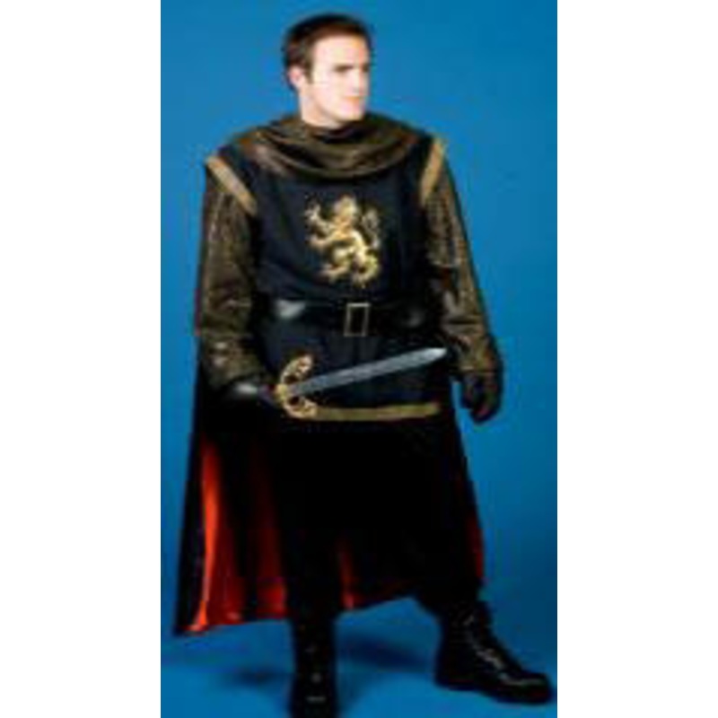 Includes: Black Tunic accented with metallic gold trim and sleeves, attached black cape with red satin lining, gold cowl and belt.Size: S (34-36), XL (46-48)SSAM57