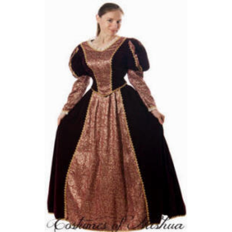 Includes: Stunning 2 piece Velvet Dress accented with gold brocade, gold metallic trim and ivory lace at collar and cuff. Color: Burgundy, Dark Teal GreenSuperior Quality / Made in USASize (Bust): S (B: 34), 2XL (B: 48) Size 2XL the back bodice is elastic