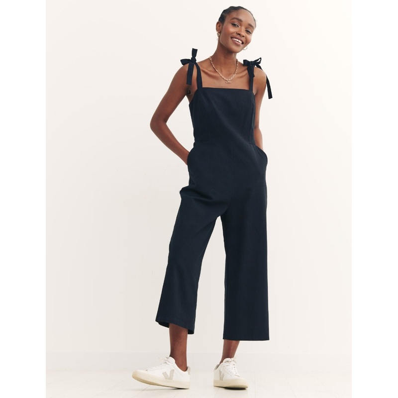 Meet Meg, your new go-to jumpsuit for casual-cool days. This black wear-forever piece features a square neck design, tie detailing on the shoulders and cropped legs. Complete the look with trainers for days on the go. It's available in curve sizing, too!