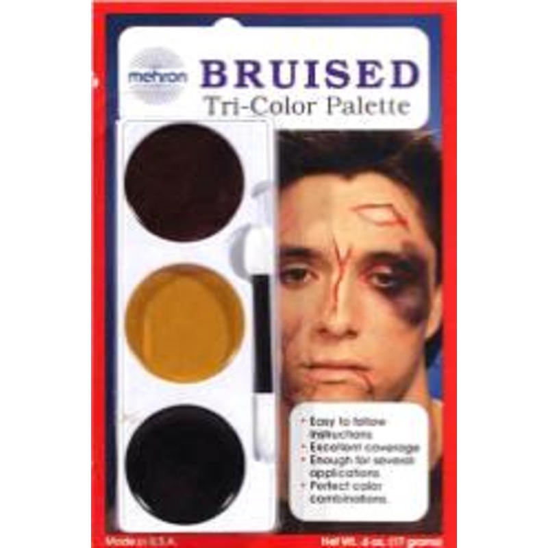Fun & easy to use. Superb quality cream makeup.Contains three complementing colors of Professional Cream Makeup (oil based sallow yellow, brown & dark purple) to create Bruised. Includes, detailed photo along with detailed instructions on how to apply the makeup & an applicator. As with any Professional Cream Makeup, must be ‘set’ with Colorset Powder. Provides complete, long lasting coverage whenset with Colorset Powder