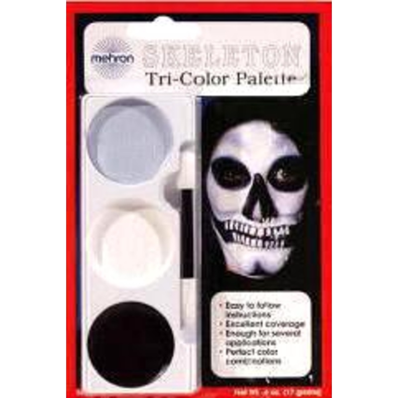 Fun & easy to use. Superb quality cream makeup. Contains three complementing colors of Professional Cream Makeup (oil based sallow black, white & light grey) to create a Skeleton. Includes, detailed photo along with detailed instructions on how to apply the makeup & an applicator. As with any Professional Cream Makeup, must be ‘set’ with Colorset Powder. Provides complete, long lasting coverage when